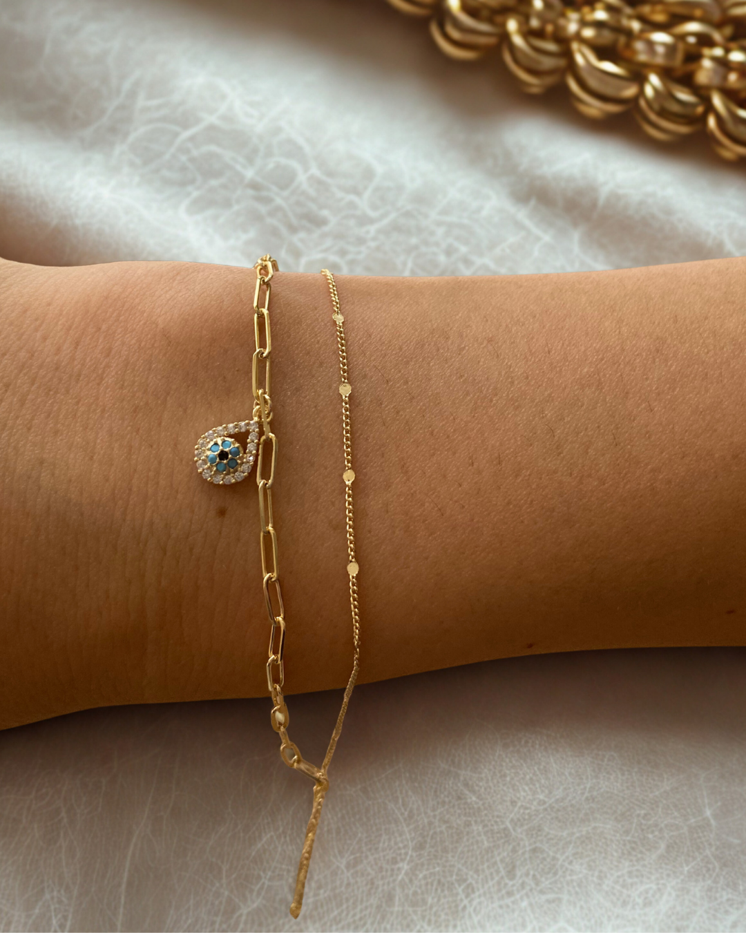 Zarif Su Damlası Nazar Boncuklu Paperclip Bileklik, şıklığı günlük yaşamla birleştirmek isteyenler için tasarlandı.